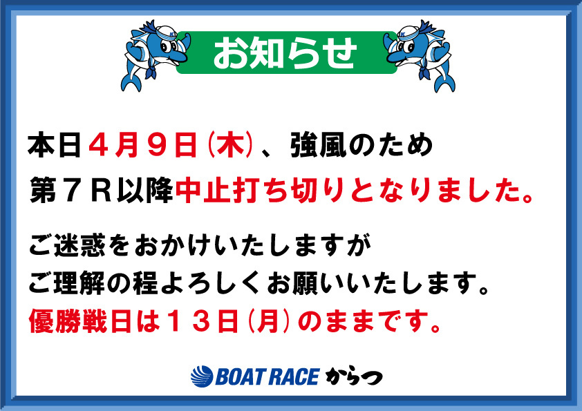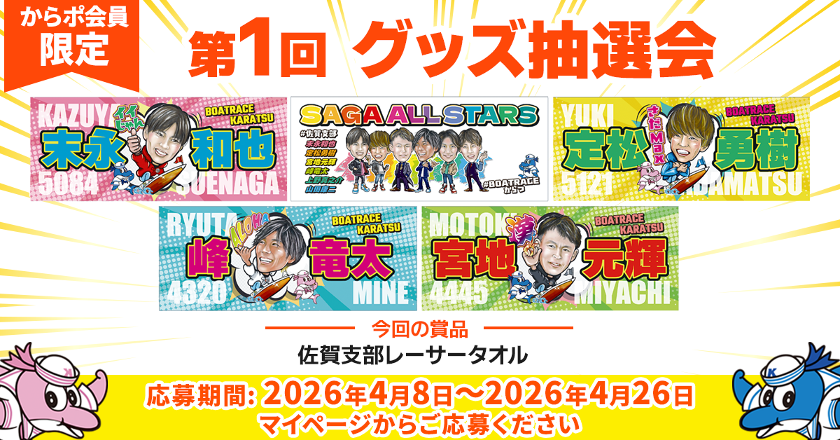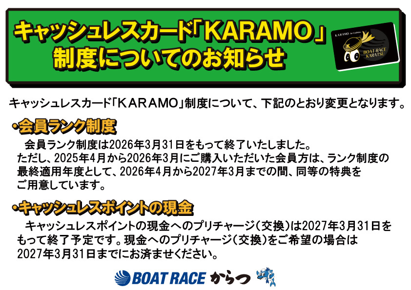 2026年3月31日まで、第1レースはからポ2倍、優勝戦はからポ5倍としておりましたが、国の指導により、倍増レースは年間12節(月1節程度)となりました。2026年4月は8日から13日に開催の「GⅢオールレディースSpring Cup」、5月は1日から6日に開催の「BOATRACE振興会会長賞GW唐津特選」が第1レース2倍、優勝戦5倍のポイント倍増レースと予定しております。6月以降はからポサイトにて随時お知らせいたします。