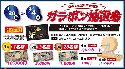 カラモカードと当日のカラモ投票レシート(対象レース:制限なし、1,000円分以上)のご提示で抽選 抽選は1人1回限り