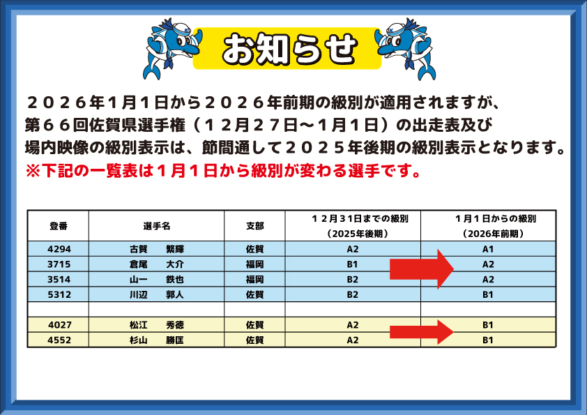 12月27日から1月1日の出走表級別表示は、2025年後期の級別表示となります。