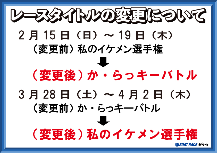 2月15日(日)から開催予定の「私のイケメン選手権」及び3月28日(土)から開催予定の「か・らっキーバトル」のタイトルを変更します!