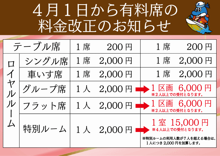 2026/03/28 ロイヤルルームグループ席等の利用料金変更のお知らせ