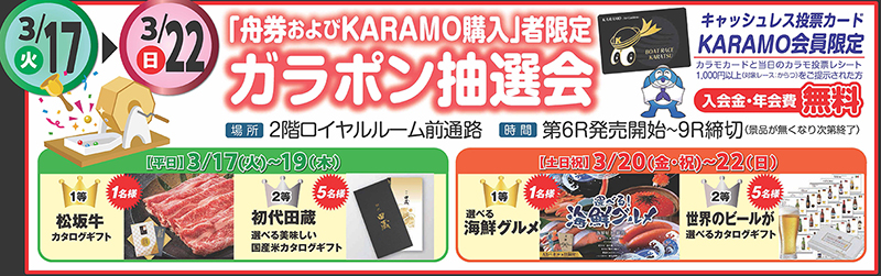【KARAMOカード利用者限定】末永和也選手SG初優勝記念クオカード(オリジナル台紙付き)が当たる!ガラポン抽選会