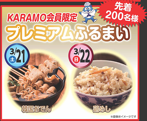 更にKARAMOカードと、購入レシート(100円以上)を提示頂いた方は詰め放題の袋がサイズアップ!