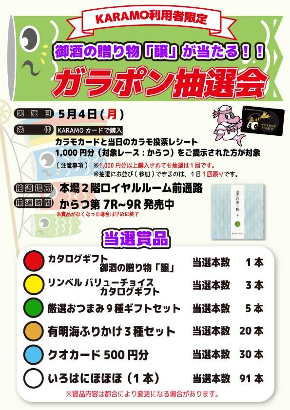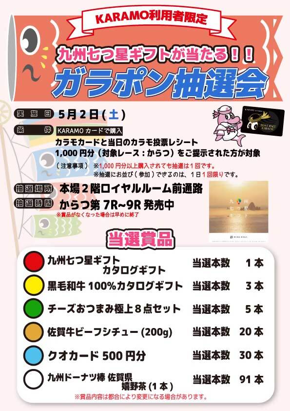 カラモカードと当日のカラモ投票レシート(対象レース:からつ、1,000円分以上)のご提示で抽選(抽選は1人1回限り)