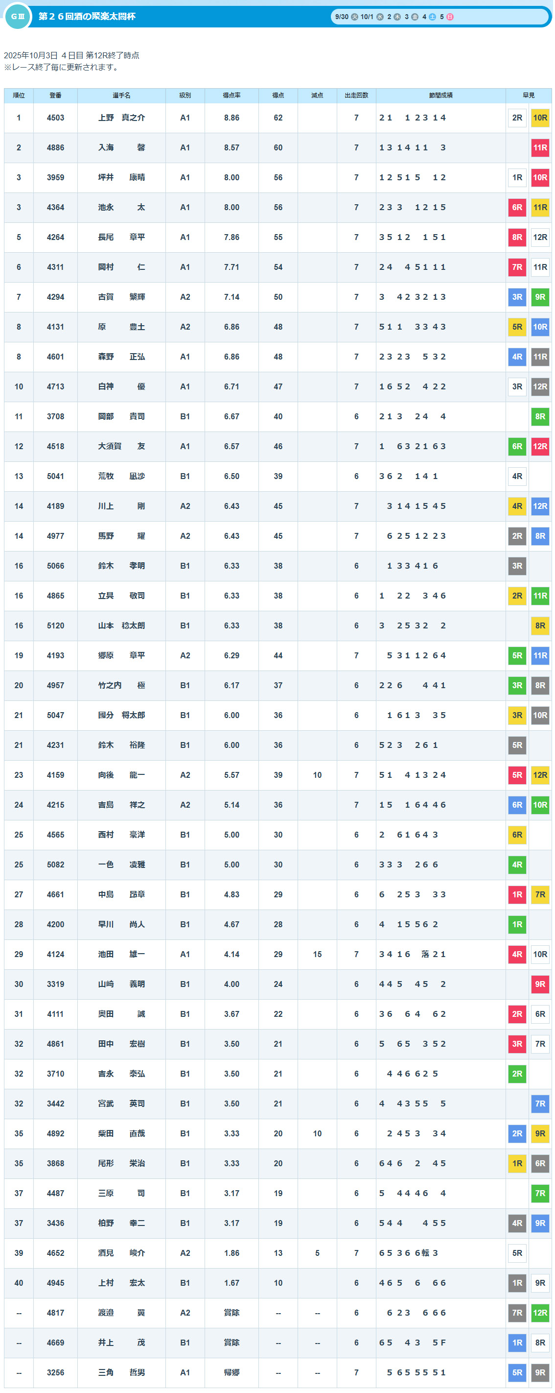 ※予選最終日までの得点率ランキングは